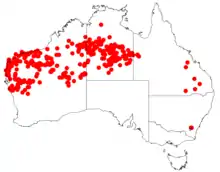 The smooth-barked coolibah is found on flats and flood plains in the Mid West, Pilbara, Kimberley and north eastern Goldfields-Esperance regions of Western Australia where it grows in sandy-loamy or clay-sand soils.[4] It is also found through much of the Northern Territory and in far western Queensland.[8]