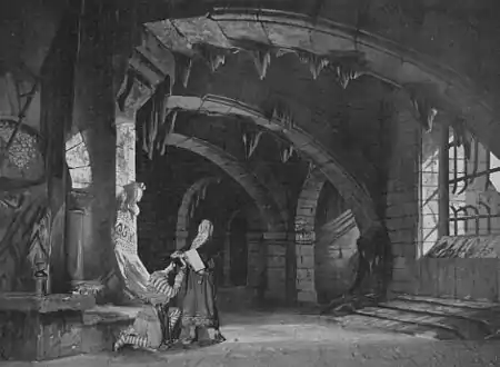 Upon Lavastre's death, in 1883, Carpezat briefly joined hands with Lavastre's younger brother, Jean-Baptiste, to design the premieres of a.o. Bruneau's Le rêve (1891), Massenet's Esclarmonde (1889) and Le mage (1891), and Saint-Saëns' Ascanio (1890). Carpezat worked independently from Lavastre's death (1891) onwards. Named the latter's successor as the Opéra's chef du service des décorations, Carpezat contributed to an immense number of stagings at the Palais Garnier: Gluck's Armide (revival, 1905), Gounod's Sapho (new production, 1884) and Faust (complete redesign, 1908), Leroux' Astarté (premiere, 1901), Massenet's Le Cid (world premiere, 1885) and Thaïs (world premiere, 1894), Rameau's Hippolyte et Aricie (modern premiere, 1908), Reyer's Salammbô (Parisian premiere, 1892), Rossini's Guillaume Tell (new production, 1899), Saint-Saëns' Samson et Dalila (Parisian premiere, 1892) and Henri VIII (new production, 1909), Verdi's Otello (Parisian premiere, 1894), and Wagner's Die Walküre (Parisian premiere, as La Valkyrie, 1893), Tannhäuser (new production, 1895) and Götterdämmerung (Opéra premiere, as Le crépuscule des dieux, 1908). In addition, Carpezat became a household name at the Comédie-Française (Sardou's Thermidor, 1891), Théâtre du Châtelet, Gaîté (Massenet's Hérodiade, 1903), Opéra-Comique (Delibes' Lakmé, 1898; Gounod's Mireille, 1901; Lalo's Le Roi d'Ys, 1888; Massenet's Manon, 1884 and 1898, Cendrillon, 1899 and Werther, 1903), Théâtre des Nations, Porte Saint-Martin (Sardou's Fédora, 1882 and Théodora, 1884, both starring Sarah Bernhardt; Rostand's Cyrano de Bergerac, 1897), and Variétés. Carpezat also accepted commissions abroad, for instance from Madrid's Zarzuela and Belém's Theatro da Paz. Carpezat received a diplôme d'honneur at the Exposition Universelle of 1878. He was awarded a grand prix and named Chevalier de la Légion d'honneur at the Exposition Universelle of 1889. He sat in the commission organizing the conference L'art théâtral at the Exposition Universelle of 1900. Numerous scenic designers of note were taught by Carpezat at his workshop at 50 Boulevard de la Villette: Ambroise Belluot, Léon Bouchet, François Carpezat (his son and successor), Demoget, Albert Dubosq, Oleguer Junyent i Sans, Lucien Jusseaume, Olivier Maréchal, Mouveau, Eugène Martial Simas and Victor Lamorte. Carpezat died at the age of 79, reportedly "aged, sad and discouraged due to no longer having any commissions from the larger theatres".[1] He was interred in his family tomb at Montparnasse Cemetery.