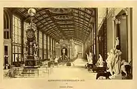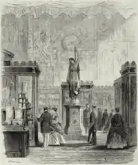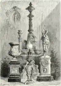 A class of its own among the conical pendulum clocks are the monumental timepieces commercialized between 1862 and 1878. When this model debuted at the London International Exhibition of 1862, it was presented as the first application of the conical pendulum to statuary.[3] In addition to the British capital, it was also displayed in the Paris Exposition des beaux-arts appliqués à l’industrie (1863), as well as in the major world's fairs held in Paris (1867 & 1878) and Philadelphia (1876).[4]