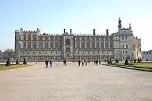 Eugène Millet died in Cannes on 24 February 1879.[1] He is buried in Saint Germain en Laye in a tomb designed by Viollet le Duc, who himself died later that year. His nephew, the architect Paul Selmersheim, paid tribute to Millet in a limited edition of Millet's Monographie de la restauration du château de Saint Germain en Laye.[4] The monograph describes and reproduces 100 of Millet's drawings.[7] Millet left behind 318 very detailed drawings of the planned Château de Saint-Germain.[5] Auguste Lafollye took over responsibility on Millet's death, continuing until 1889.[8] The work was finally completed in 1907 by Honoré Daumet, who placed an inscription above the entrance saying "This château was restored from 1862 to 1906 by Eugène Millet."[5]