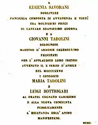 - The notice, or epigrafia, was published in the name of Maria Tadolini, the bridegroom's sister and her husband, Luigi Bottrigari. It is reproduced in Rambelli (1853) p. 92.