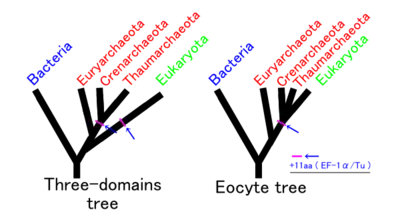- Eukaryotes developed from Archaea, and acquired their bacterial characteristics through the endosymbiosis of a proto-mitochondrion of bacterial origin.[116]