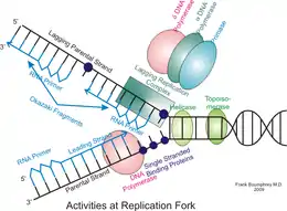 - Burgers PM (February 2009). "Polymerase dynamics at the eukaryotic DNA replication fork". The Journal of Biological Chemistry. 284 (7): 4041–5. doi:10.1074/jbc.R800062200. PMC 2640984. PMID 18835809.