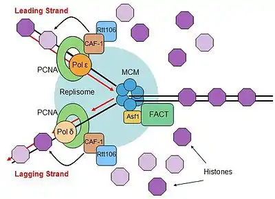 - Groth A, Corpet A, Cook AJ, Roche D, Bartek J, Lukas J, Almouzni G (December 2007). "Regulation of replication fork progression through histone supply and demand". Science. 318 (5858): 1928–31. Bibcode:2007Sci...318.1928G. doi:10.1126/science.1148992. hdl:1885/53159. PMID 18096807. S2CID 22350778.