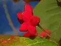 The hermaphrodite flowers are produced in late spring and are insect-pollinated; they are rather inconspicuous, small, yellowish green and grow in cymes of 3–8 together. The capsular fruit ripens in autumn, and is red to purple or pink in colour and approximately 1–1.5 cm wide. When ripe, the four lobes split open to reveal the orange seeds.