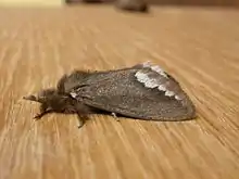 The wingspan is about 40 mm. Adults have a dark brown body and brown wings. The wings have a band of white along the edges.[2]