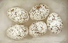Crag martin pairs nest alone or in small colonies, usually containing fewer than ten nests.[12] Nests are on average 30 m (98 ft) apart and each pair aggressively defends its breeding territory against other crag martin and most other bird species. Nesting takes place from May to August, and usually two broods are raised. The nest, built by both adults, is an open half cup made of mud and lined with soft material such as feathers or dry grass.[27] It is constructed under an overhang on a rock cliff face, in a crevice or cave, or on a man-made structure. It takes one to three weeks to build and is re-used for the second brood and in subsequent years. The clutch is two to five eggs with an average of three. The eggs are white with brownish blotches particularly at the wide end, and average 20.2 mm × 14.0 mm (0.80 in × 0.55 in) with a weight of 2.08 g (0.073 oz). The eggs are incubated mainly by the female for 13–17 days to hatching, and the chicks take another 24–27 days to fledge. Both parents feed the chicks bringing food every two to five minutes, and the young are fed for 14–21 days after fledging.[6] With such frequent feeding rates the adults mainly forage in the best hunting zones in the immediate vicinity of the nest, since the further they fly to forage the longer it would take to bring food to the chicks in the nest.[15] In an Italian study, the hatching rate was 80.2 percent, and the average number of fledged young was 3.1.[28]