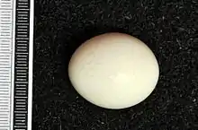 Eurasian scops owls breed in open woodland, parks and gardens. The nest is usually a hole in a tree or in a wall, but can sometime be an old nest of another species such as a crow. The clutch is usually 4–5 eggs. These are white and measure 31 mm × 27 mm (1.2 in × 1.1 in) and weigh around 13 g (0.46 oz). The eggs are incubated only by the female. They hatch after 24-25 days. The young are cared for and fed by both parents. They fledge when aged 21–29 days and become independent of their parents at 30–40 days of age.[11]