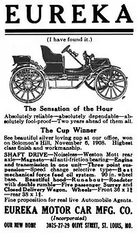 The Eureka was an American automobile made from 1907 to 1909. It was a wheel-steered high wheeler from St. Louis, Missouri, with a two-cylinder 10/12 hp air-cooled engine and conventional sliding gear transmission.
