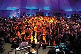 Europa-Park offers about a dozen different shows, including figure skating, variety shows, and Flamenco, as well as a puppet theatre and junior club studios, the last being an interactive show in which children can experience the world of filmmaking.[30] One of the shows is the rotary theater-multimediashow "Zeitreise". In the center is a circular theater, divided into six sectors, that the seats circle around, each audience member being shown one sector after another. For the 35th anniversary of the Europa-Park, on the 12th of July 2010, the theater was remodeled and got a new show name, "Europa-Park Historama - die Show". It showed the 35-year-old history of the Europa-Park with spectacular 4D-effects and a 180 degree-view. Since the summer season of 2018, the rotary theater has been used as a "preview center" for the waterpark Rulantica. In the baroque theater Europa-Park Teatro, which is located in the Italian-themed-area, the musical "Spook Me!" was performed many times a day during the Halloween season of 2014 to 2017.[31] In the summer seasons of 2018 and 2019, "Rulantica-The Musical" was performed there. Both musicals were composed by Hendrik Schwarzer.[32] In the summer season the park shows the magic show "It´s Magic!", in which the magician Peter Valance appears, among others.[33] The annual thematically changing dinner show "Cirque d'Europe" takes place here in winter as well.
