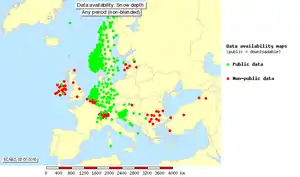The data in the ECA&D database is accessible in many different ways. One can view Time series plots for each index and station, maps of trends over Europe for each index, maps of index anomalies (with respect to the normal period 1961-1990) for a particular year or season, as well as climatology maps depicting index behavior for two periods in the past: 1961–1990 and 1971–2000. One can also request daily data (minimum, mean and maximum temperature as well as precipitation amount) via a custom query in ASCII format, by downloading predefined ASCII subsets, or by accessing the E–OBS daily gridded dataset through the ENSEMBLES project (see below). Both the ASCII custom queries and the predefined ASCII subsets are available for both blended and non-blended data.