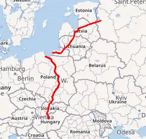 European route E 77 is a part of the inter-European road system. This Class A intermediate north–south route is 1,690 km (1,050 mi) long and it connects the Baltic Sea with the central part of the continent.