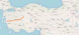 European route E96 or E96 is a European route running from İzmir in Turkey (connected to European route E881) to Sivrihisar (in Turkey), which is connected to European route E90. The road is a Class A West-East reference road in the European road network.