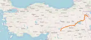 The European route E99 or E99 is a European road running from Dəmirçi, Azerbaijan to Akçakale in Turkey on Syrian border.