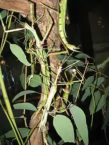 As they are easy to care for and effectively harmless to humans, the goliath stick insect is commonly kept as an exotic pet and it is particularly popular among children.[1] E. goliath is bred in captivity on a global scale, with nymphs and eggs available to buy at online retailers to be shipped globally.[23] Adults raised in captivity are said to live 6–7 months.[15] The insect is also often used in educational displays at museums and zoos.[24][25] Due to their size, sightings of wild E. goliath are also often mentioned in local newspapers.[2]