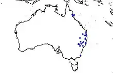 The goliath stick insect is widespread throughout Australia's east coast in New South Wales and southern Queensland.[2] Small populations have also been reported in northern Queensland and Tasmania.[1] They can be encountered within bushland, rainforests and in green spaces such as parks and gardens.[2]