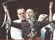 ![]() Still of the film: Juan Perón (Víctor Laplace) holds a weakened Eva Perón (Esther Goris), resembling the real Evita's last speech. | |