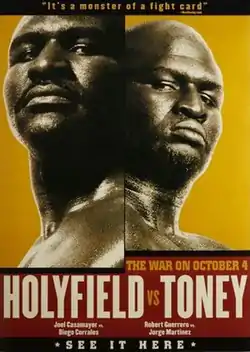 Holyfield's previous fight had been a loss to Chris Byrd in an IBF heavyweight title fight. Following the loss, Holyfield had entered negotiations with promoter Don King to face then-WBA heavyweight champion Roy Jones Jr. Jones' promoter claimed Holyfield was offered a $10 million purse, but negotiations fell through when Holyfield demanded an additional $2 million added on because he claimed King owed him such. After the proposed Holyfield–Jones fight fell through, Holyfield instead reached an agreement to face Toney[2] Toney had won the IBF cruiserweight title in April by defeating Vassiliy Jirov, giving him his first major title since 1994 and making him a 3-division world champion as he had previously captured titles in both the middleweight and super middleweight divisions. Toney and his promoter Dan Goossen had agreed that if Toney beat Jirov for the cruiserweight title, then he could "do what he wanted." After doing so, Toney then decided to move up to the heavyweight division.[3]