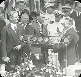 Lindbergh looks on as President Calvin Coolidge presents her son with the Distinguished Flying in 1927