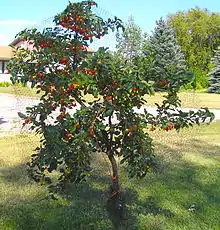 ![]() A young Evans Cherry tree growing in Montana, with ripening cherries | |