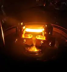 - In the thermal method, metal material (in the form of wire, pellets, shot) is fed onto heated semimetal (ceramic) evaporators known as "boats" due to their shape. A pool of melted metal forms in the boat cavity and evaporates into a cloud above the source. Alternatively the source material is placed in a crucible, which is radiatively heated by an electric filament, or the source material may be hung from the filament itself (filament evaporation).