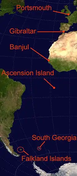 Throughout the operation, 43 British merchant ships (ships taken up from trade, or STUFT), served with or supplied the task force. Cargo vessels and tankers for fuel and water formed an 8,000-mile (13,000 km) logistics chain between Britain and the South Atlantic.[25]