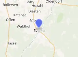 Eversen is located on the boundary of the Südheide Nature Park about 16 kilometres (9.9 mi) north of the town of Celle and about 10 kilometres (6.2 mi) southwest of Hermannsburg on the L 240 state road that runs from Celle to Hermannsburg. The village lies on a sandy island of loess in the glacial valley of the Örtze which was formed in the Weichselian Ice Age.[2] It is responsible for administering the neighbouring hamlets of Feuerschützenbostel and Altensalzkoth and the farmstead of Kohlenbach. Feuerschützenbostel is about 2.5 km to the southwest, Altensalzkoth about 1.5 km southeast and Kohlenbach about 2.5 km southeast of Eversen.