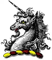 A Demi-Unicorn Argent, Guttée-de-sang, and crined Or.