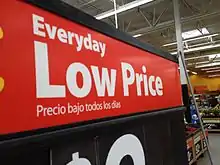 Everyday low price (also abbreviated as EDLP) is a pricing strategy promising consumers a low price without the need to wait for sale price events or comparison shopping. EDLP saves retail stores the effort and expense needed to mark down prices in the store during sale events, and is also believed to generate shopper loyalty.[1] It was noted in 1994 that the Walmart retail chain in the United States, which follows an EDLP strategy, would buy "feature advertisements" in newspapers on a monthly basis, while its competitors would advertise weekly.[1][2] Other firms that have implemented or promoted EDLP are Procter & Gamble, Food Lion, Gordmans and Winn-Dixie.[2]