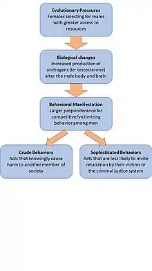 The evolutionary neuroandrogenic (ENA) theory is a conceptual framework which seeks to explain trends in violent and criminal behavior from an evolutionary and biological perspective. It was first proposed by the sociologist Lee Ellis in 2005 in his paper "A Theory Explaining Biological Correlates of Criminality" published in the European Journal of Criminology.[1] Since then, it has expanded into an interdisciplinary field that intersects biology, psychology, and sociology. The theory rests on two propositions. The first is that in human mating behavior, females prefer males that appear to be more competent providers of resources, and so males exhibit increased competitive behavior than females to obtain access to those resources. The second is that biological mechanisms (namely increased presence of androgens) lead to differential development in the male brain which then mediates the increased competitive behaviors that cause criminality. Though it was originally intended to explain high rates of criminality in young men, it has since been used as a framework to explain gang behavior, terrorism, and the rise of the criminal justice system.[2]