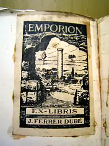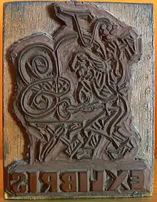 An Ex Libris (or ex-librīs, Latin for '"from the books (or library)"'),[1][2] also known as a bookplate (or book-plate, as it was commonly styled until the early 20th century,[3]), is a printed or decorative label pasted into a book, often on the front endpaper, to indicate ownership. Simple typographical bookplates are termed "book labels".[4]