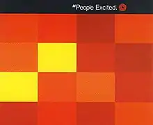 The UK album artwork is slightly different with the same 16 differently shaded red rectangles laid out in a 4 x 4 pattern but two of the yellow boxes are in a different arrangement and the black title banner across the top.