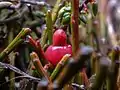 Exocarpos humifusus is a rigid, woody dwarf shrub with branches prostrate and spreading over the ground and rocks.[2] The stems are dark yellow-green tinged with red, and are ribbed with rounded edges.[2] The leaves are triangular and scale shaped, about 0.5 mm (0.020 in) long, arranged alternately along the stem.[2][3] The flowers are generally 4 parted, approximately 2.5 mm (0.098 in) in diameter and grow in bunches of 2-3 on a short stalk at the end of a stem.[2] The fruit is a small greenish-black drupe or nut 3–4 mm (0.12–0.16 in) in length, that grows atop a fleshy receptacle.[2][4] When mature the receptacle of the fruit is dark red fleshy, juicy and edible, attracting animals as distributors.[4]