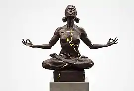 Bradley began with a wax sculpture of a woman who appears in to be meditating in the lotus position. She then dropped the sculpture on the floor allowing it to break into pieces. Bradley cast the pieces of the wax sculpture in bronze, and assembled the pieces so that they floated apart from one another and then she had a lighting specialist construct a system which lights the statue from within.[1][2] The work was first displayed in New York in 2004.[3]