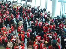 In August 2007, the Camp for Climate Action took place within a mile of Heathrow. The camp ran for a week and on its final day some 1000–1400 people protested and 200 people blockaded British Airports Authority HQ.[74] Before the camp BAA requested the "mother of all injunctions" which could have restricted the movements of 5 million people from 15 different organisations, including the RSPB, Greenpeace, the Campaign for the Protection of Rural England, the Woodland Trust, Friends of the Earth, and the National Trust.[75][76] The injunction would technically have included the Queen; patron of the RSPB and CPRE, Prince Charles; in his position as President of the National Trust, and even some of BAA's own staff.[77]
