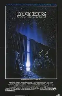 A rumor persists that the script for Explorers had been circulating Hollywood offices for years before it was made, and that it was bought by the studio because a scene of "children flying through the sky on bicycles" appealed to Steven Spielberg for his film E.T. the Extra-Terrestrial.[7] The film was originally to be directed by Wolfgang Petersen having initially impressed Paramount executives with his family-targeted The NeverEnding Story. Petersen wanted to film it in his native Germany. The studio decided to settle in the States with an American director and Petersen was not long after commissioned by 20th Century Fox to take over the production of Enemy Mine. "The funny thing about it is that when I was first given the script, I was coming off Gremlins and in a rare point in my career I was like 'hey, let's get this guy,'" said Dante during a Q&A and screening of the film in 2008. Dante liked what he read but did not feel there was a third act. "At the end when the kids went to the planet, they go and play baseball. That was the plot. It seemed that wasn't quite enough." While discussing the script with Paramount executives, they said "we can work on it while we're making the picture." Dante and the writer, Eric Luke, were "improvising what they were going to do" while the film was being made.[5]