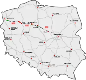 Expressway S10 or express road S10 (in Polish droga ekspresowa S10) is major road in Poland which, when completed, will serve as a direct route between Szczecin and Warsaw. It has been planned to run from the junction with Motorway A6 on the eastern outskirts of Szczecin, through Bydgoszcz and Toruń, to a junction with express road S50 near Płock, west of Warsaw. As of late 2017, only short stretches of S10 near Szczecin, Bydgoszcz and Toruń have been built (about 56 km (35 mi) in total), out of the total planned length of 460 km (290 mi). As of November 2017, 56 km (35 mi) of road were built. According to current plans, the bulk of this road will be built after 2020. [1] However, key stretches with high traffic densities may be built earlier.