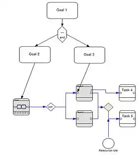 Goals are related in a hierarchical format where you find some goals are dependent on other sub goals for them to be complete which means all the sub goals must be achieved for the main goal to be achieved. There is other goals where only one of the goals need to be fulfilled for the main goal to be achieved. In goal modelling, there is use of deontic operator which falls in between the context and achieved state.[10] Goals apply to tasks, milestones, resource roles and resources as well and can be considered as action rule for at task. EEML rules were also possible to although the goal modelling requires much more consultation in finding the connections between rules on the different levels.[11] Goal-oriented analysis focuses on the description and evaluation of alternatives and their relationship to the organisational objectives.[12]