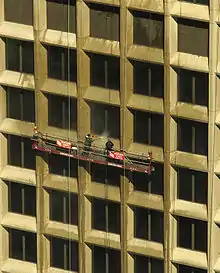 Cleaning a skyscraper on a suspended stage.