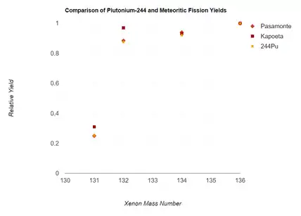 Preceding the analysis of mass spectra data obtained by analyzing samples found in meteorites, it was inferential at best to accredit 244Pu as being the nuclide responsible for the fissiogenic xenon found. But an analysis of a laboratory sample of 244Pu compared with that of fissiogenic xenon gathered from the meteorites Pasamonte and Kapoeta produced matching spectra that immediately left little doubt as to the source of the isotopic xenon anomalies. Spectra data was further acquired for another actinide, 244Cm, but such data proved contradictory and helped erase further doubts that the fission was appropriately attributed to 244Pu.[11]