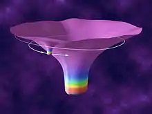 In astrophysics, an extreme mass ratio inspiral (EMRI) is the orbit of a relatively light object around a much heavier (by a factor 10,000 or more) object, that gradually decays due to the emission of gravitational waves. Such systems are likely to be found in the centers of galaxies, where stellar mass compact objects, such as stellar black holes and neutron stars, may be found orbiting a supermassive black hole.[1] In the case of a black hole in orbit around another black hole this is an extreme mass ratio binary black hole. The term EMRI is sometimes used as a shorthand to denote the emitted gravitational waveform as well as the orbit itself.