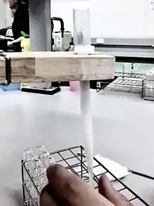 Pasteur pipettes can also be used for microscale distillation.[12] The liquid to be distilled is placed into a small reaction tube along with a boiling chip and heated to reflux one-half to two-thirds of the way up the inside of the tube. After squeezing the bulb to expel air, a pasteur pipette is inserted into the tube just below the level of the ring of refluxing liquid (into the vapor). The vapor is then drawn into the relatively cold pipette tip, causing it to condense and accumulate inside of the pipette.
