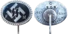 A Förderndes Mitglied der SS (SS-FM; SS Patron Members) was a member of the Allgemeine SS (General SS) who did not take part in active duty, but instead contributed financially to the SS. The SS-FM was organised by the SS Main Economic and Administrative Office, and started in 1926. Members of the SS-FM made monthly payments towards the work of the SS at their local SS headquarters. For people with low income, contributions were low; no minimum contribution was prescribed. Each member was issued with a lapel pin and a receipt book. From April 1934, members also received a monthly magazine - FM-Zeitschrift- which was produced by the SS High Command.[1][2] By 1939, circulation of FM-Zeitschrift was approximately 365,000,[1] but few copies of the magazine survive today.[2]
