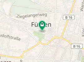 The station is located to the west of the town, about 200 metres northeast of central Füssen. The station building is located on Bahnhofsstraße, to the southeast of the railway tracks. On the south side of Bahnhofstrasse is the station parking area, including the bus station. Further south of the street is a park. To the east is Rupprechtstraße, to the northeast is the street of Am Ziegelstadl. Further north, there is the Ziegelberg (hill), which is surrounded by a wooded area. The surrounding development is dominated by the tax office, to the north, the post office and the Hotel Luitpold to the southeast.[3]