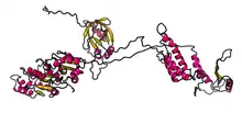 A tertiary structure has not yet been confirmed by X-ray crystallography. Predictions of tertiary structure indicate a modular protein, composed of three modules connected by random coil.