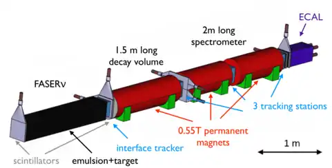 Located at the front end of FASER is the FASERν neutrino detector. It consists of many layers of emulsion films interleaved with tungsten plates as target material for neutrino interactions. Behind FASERν and at the entrance to the main detector is a charged particle veto consisting of plastic scintillators.[11][12] This is followed by a 1.5 meter long empty decay volume and a 2 meter long spectrometer, which are placed in a 0.55 T magnetic field. The spectrometer consists of three tracking stations, composed of layers of precision silicon strip detectors, to detect charged particles produced in the decay of long-lived particles. Located at the end is an electromagnetic calorimeter.