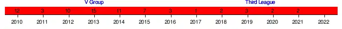 | 2010–11 | V Group | 3 | 23 | 9 | 6 | 69 | 37 | 78 | not qualified | ||
