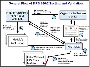 All of the tests under the CMVP are handled by third-party laboratories that are accredited as Cryptographic Module Testing laboratories[7] by the National Voluntary Laboratory Accreditation Program(NVLAP).[8] Vendors interested in validation testing may select any of the twenty-one accredited labs.