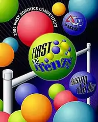 FIRST Frenzy: Raising the Bar was the 2004 game for the FIRST Robotics Competition. The game included elements from previous years' games, including mobile goals, "capping" goals with large inflatable balls, and others. In Raising the Bar, teams could score by having their human player score purple balls in any of the goals, capping the goals with a multiplier ball, or hanging their robot suspended from the 10-foot (3.0 m) high 'chin up bar'. In the qualifying matches, Teams competed in 2-member randomly generated alliances. In the elimination rounds, 3-member alliances competed against each other with one team sitting out each match. The alliance that won two matches advanced in the tournament.
