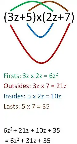 Many students and educators in the United States now use the word "FOIL" as a verb meaning "to expand the product of two binomials".[4]
